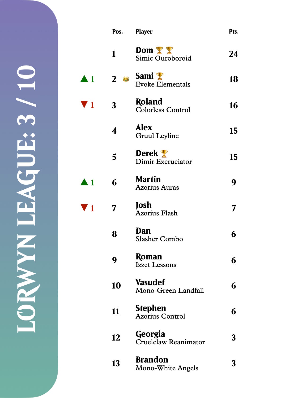 Derek, too, needs this win to get a foothold on the league’s highest places, but Martin proves a formidable gatekeeper to the league’s highest highs. His blue-white enchantments deck closes it out; for the first time in league history, Derek loses a match.