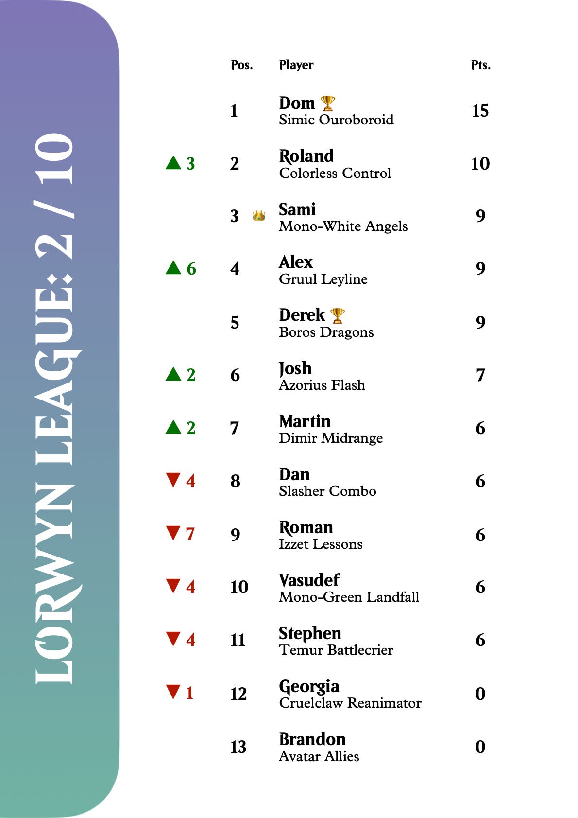 Overall, Alex surges up from tenth to fourth in the league standings. Derek, the night’s undefeated player, comes straight in at fifth. Roland sits in second, his draw with Josh putting him ahead of Sami by a single point. Dom still leads the league, but he lost to Derek, and narrowly won against Martin.
